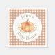 This boho baby shower paper napkin features a watercolor pumpkin, fall foliage and orange brown plaid pattern border.