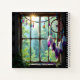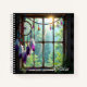 Personalised notebook. A rustic window with a purple feathered dreamcatcher hanging in the window along with colourful sparkly crystals. The window overlooks a beautiful array of trees and sunbeams shining through.