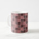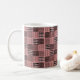 This mug has a Boho design of squares with patterns in each in black and pink.