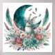 Boho Rabbit Bunny with teal and mauve colours framed by a crescent moon, feathers and flowers. Beautiful mixed floral design perfect for baby's nursery room.