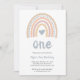 Cute boy First Birthday Invitation with a boho rainbow in muted pastel colours along with a blue heart in the middle. The header reads, "One" in script. The backside has a pattern with the same rainbow as the front. This kids birthday invitation is shown for a first birthday party, but may be customised for any age.