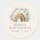 Boho Rainbow Classic Round Sticker. Introducing our enchanting Boho Rainbow Baby Shower Collection, where whimsical hand-painted watercolor rainbows in earthy tones of sage green, terracotta, and tan dance alongside trendy eucalyptus botanicals on a serene beige backdrop, with a complementary pattern on the reverse in deep sage. Embracing a rustic, bohemian chic aesthetic, this collection encompasses everything you need for a memorable celebration, from exquisite invitations and enclosure cards to a charming welcome sign, delightful gift tags, favour bags, and even coordinating paper plates, cups, and napkins. Let this collection set the stage for a joyous and stylish gathering to celebrate the impending arrival of your little one.