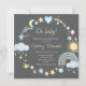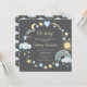 This cute and whimsical baby shower invitation features a rainbow, clouds, sunshine, moon and stars in blue and yellow on a dark grey background. The text combines handwritten script and sans serif fonts for a stylish and modern look. This is perfect for a weather themed baby shower.
