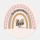 Boho Rainbow Heart Love Bible Verse Classic Round Sticker. Experience the boho vibe with a soft-coloured rainbow and a timeless quote from the Bible nestled within. At the heart of it all, the word 'love' is bold and bright, as a beacon of compassion and unity.