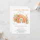 This design features a baby shower theme "A Little Miracle Is On The Way" with a hand-painted watercolour rainbow in soft terracotta, sage green, blush and warm neutral tones, this design blends Scandinavian minimalism with timeless boho charm. Flower, clouds and celestial accents. This invitation can be easily personalised with your personal event details.