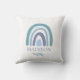The throw pillow features a charming and minimalist design. At the centre, there is a semi-circle rainbow composed of five curved bands in shades of blue and teal. Below the rainbow, the personalised name" is written in a soft, cursive font in a matching teal colour. To the right of the name, there is a small sprig of leaves in the same teal shade, adding a delicate touch to the design. The overall look is simple, modern, and personalised, with a calming colour palette.