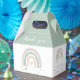 Boho baby shower favour box featuring "thank you" in a stylish white script with swashes and a cute abstract watercolor of a sage green, orange and lavender rainbow with hearts. Personalise with the mother-to-be's name and shower date.