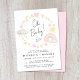 Whimsical boho baby girl couples shower invitation featuring pink and yellow watercolors of a rainbow, sun, hearts, stars, moons and clouds, "Oh Baby!" in a stylish script and the names of the mother and father and the shower details in simple typography.