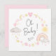 Whimsical boho baby girl shower invitation that features pastel pink and yellow watercolors of a rainbow, sun, hearts, stars, moons and clouds and "Oh Baby!" in a stylish calligraphy script. On the back, personalise the mother-to-be's name in a chic script and add the shower details in simple modern typography.