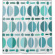 A vintage style mid century modern pattern with geometric bowls shapes, dots and lines. Shades of blue-green and white.