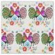 This is cute fabric for many projects, including kitchen curtains or anything kitchen related. It features a wonderful design of two proud roosters standing breast to breast. One rooster is coloured red, green, pink purple, and black, and the other one is pink, red and black. The rooster images are framed with brilliantly coloured flower images in red, gold, yellow, blue, and green. Very colourful, bright, and fun for use throughout the year. Be sure to see our matching kitchen designs in our store.