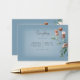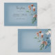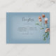 This wedding reception card design features beautiful blue and burnt orange rust watercolor corner florals on a soft white blur rectangle placed on a dusty blue background. Soft and delicate; perfect for any season. Created by Simply Farmhouse Press.