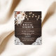 Boho rustic bridal shower invitation features mason jars with glow lights, beige and white flowers and pampa grass on a wood background.