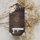 Boho rustic wedding invitation features neutral flowers and string lights on a wood background.