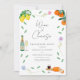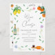 Beautiful whimsical boho cheese and wine themed modern colourful watercolor wedding engagement invitation with simple botanicals, orange and lemon citrus theme ideal for a sunny summer European themed wedding engagement party. Original artwork by artist Catherine Sweetman includes foliage, wildflowers, cheese and wine, musical notes and wine flutes of sparkling bubbly wine. Whimsical handwriting and modern typography script with easy to personalise templates to add names, the date and other essential information along with the bride and groom to be initials on the sparkling wine bottle label illustration. Colour palette includes lemon, yellow, orange, green, blue, purple and pink.