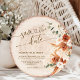 Trending 2026 boho rustic wood slice wedding invitation with pampas grass, terracotta roses, eucalyptus & natural tree ring design. Add your circular engagement photo! Elegant script invites guests to Avery & James’ April 25 celebration at The Secret Gardens of Cambria, California. Earthy boho pampas wedding stationery!