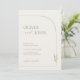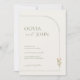 This invitation beautifully blends minimalist elegance with a warm bohemian vibe. The back features an arch-shaped Details slot for you to add you own reception, accommodation and RSVP details., set against a calming sage green background with delicate white line-art arches.