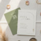 This invitation beautifully blends minimalist elegance with a warm bohemian vibe. The back features an arch-shaped Details slot with QR for you to add you own QR Code, reception, accommodation and RSVP details., set against a calming sage green background with delicate white line-art arches.