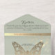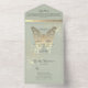 A distinctively bohemian sage green all-in-one wedding invitation, adorned with a romantic faux gold butterfly—symbolising spiritual renewal, hope, and life. This elegant and meaningful design evokes charm and grace. Personalise with your wedding details and RSVP information for a truly special touch.