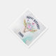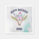 Birthday party paper napkins with a turquoise and pastel watercolor background. A boho chic animal skull with a floral bouquet upon its head and little butterflies fluttering about.