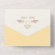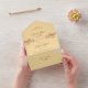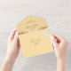A bohemian-style all-in-one wedding invitation featuring earthy tones, ivory, and soft yellow hues. The design showcases a romantic gold rope heart at the centre, symbolising unity and love. Simple, elegant calligraphy script enhances the romantic feel, and the invitation includes RSVP details and a sleek wedding website link. The back of the invitation is hand-addressed, adding a personal touch. The overall design should feel organic and intimate, with a mix of timeless elegance and modern simplicity, perfect for a spring wedding celebration.