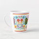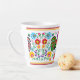 If you like lots of colour, you'll love this cute boho style inspired mug! It features a wonderful design of two proud roosters standing breast to breast. One rooster is coloured red, green, pink purple, and black, and the other one is pink, red and black. The rooster images are framed with brilliantly coloured flower images in red, gold, yellow, blue, and green. The pattern is lined at the top and bottom with matching red and gold lines.