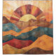 This boho sunset artwork shower curtain features layered mountains in warm earthy tones of orange, red, and gold, with a radiant sunburst shining above the peaks. The retro-inspired design blends rustic textures with modern bohemian style, creating a bold yet calming landscape aesthetic. Perfect for nature lovers and free spirits, this design adds warmth and character to any space. A great gift idea for birthdays, housewarmings, and seasonal occasions, especially for those who love outdoor adventures, hiking, or boho-inspired decor.