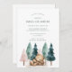 Whimsical boho simple watercolor, sleeping teddy bear forest baby shower invitation, in hues of green and rose.