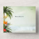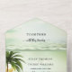 Elegant boho all in one tear-away wedding invitation featuring a tropical coastal design with palm trees, festive lanterns and colourful flowers overlooking a pale green sparkling beach