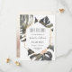 A beautifully tropical boho stylish wedding Save the Date card with your lush tropical watercolor botanicals that includes beige-peach orchids and sweetheart roses with Monstera leaf foliage. A geometric gold edged frame surrounds your text in modern style. Personalise the text template with your wedding details.