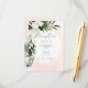This wedding reception card design features beautiful, lush tropic greenery and white florals on a soft peach blush watercolor background. Perfect for the destination or beach wedding. Created by Simply Farmhouse Press.