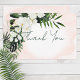 This wedding thank you card design features beautiful, lush tropic greenery and white florals on a soft peach blush watercolor background. Perfect for the destination or beach wedding. Use the included message or add your own. Created by Simply Farmhouse Press.