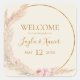 This boho tropical botanical | ivory wedding welcome square sticker is perfect for your elegant rustic floral, green, peach, rose gold wedding. Design features a gold frame or bouquet with modern blush pink pampas grass, simple sage, ivory, champagne palm leaf, and classic beach greenery. The flowers may include pink rose and orchid. The design is ideal for a classy vintage terracotta, beige, rust, winter, spring, fall wedding. Please find other matching or coordinating wedding stationery in the rest of the collection suite.