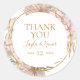 This boho tropical botanical | thank you wedding favour classic round sticker is perfect for your elegant rustic floral, green, peach, rose gold wedding. Design features a gold frame or bouquet with modern blush pink pampas grass, simple sage, ivory, champagne palm leaf, and classic beach greenery. The flowers may include pink rose and orchid. The design is ideal for a classy vintage terracotta, beige, rust, winter, spring, fall wedding. Please find other matching or coordinating wedding stationery in the rest of the collection suite.
