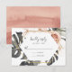 Elegant, tropical wedding RSVP card featuring your RSVP date and custom accepts/declines wording surrounded by a faux gold geometric frame, dark green tropical leaves & blush peonies and orchids. The back of the wedding response cards feature a blush watercolor background. Designed to coordinate with our Boho Tropical Floral wedding collection.