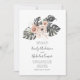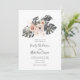 Elegant, unique floral wedding invitation featuring your wedding details displayed below an arrangement of dark green tropical leaves & blush peonies and orchids. The back of the invite features a blush watercolor background. Designed to coordinate with our Boho Tropical Floral wedding collection.