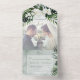 AVAILABLE WITH OR WITHOUT A QR CODE OR DINNER OPTIONS. This design features beautiful, lush tropic greenery and white florals on a soft lush green watercolor background. Personalise it with your own special photo. Perfect for the destination or beach wedding. Created by Simply Farmhouse Press.