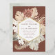 Modern tropical wedding invitations featuring your names inside of a gold foil geometric frame with a brown background. Tropical flowers and foliage surround the frame in earthy shades of cream, tan, beige, rust, brown, and sage green. The tropical boho wedding invitations reverse to a light sage green watercolor background.