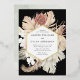 Modern tropical wedding invitations featuring your names inside of a gold foil geometric frame with a dark charcoal background. Tropical flowers and foliage surround the frame in earthy shades of cream, tan, beige, rust, brown, and sage green. The tropical boho wedding invitations reverse to a light sage green watercolor background.