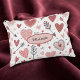 This pretty personalised pillow makes a nice Valentine's Day gift for a sweetheart or a child. The pattern includes red and pink boho stylised hearts, arrows and stars on a white background. On the front centre is a matching pink oval banner with a name written in black. The back of the pillow has the same Valentine pattern but without the banner or name.