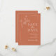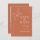 This wedding save the date features a minimalist and elegant design with a warm terracotta background, delicate floral illustration, clean typography, and simple corner accents. The front highlights the event details in a refined layout, while the back showcases a romantic couple’s photo with their names below. The overall look is modern, romantic, and sophisticated.