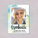 This chic photo graduation announcement features the word "Graduate" written in beautiful calligraphy, a subtle blue and green watercolor background, and a framed photo of the new graduate. Grad party details can be added to the back of the card.