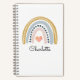 A cute personalised kid's watercolor boho rainbow notebook featuring a pink mustard and blue rainbow with pink heart in the middle and name.