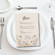 This BOHO Watercolor Wildflowers Elegant Beige Wedding Menu features beautiful blue and yellow wildflowers, menu options, optional text on the back, and modern typography. Your wedding reception guests will love having a choice of meal options at your wedding.