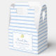 Relaxed boho inspired favour box design with wavy border and blue and white stripes and simple single lemon, evoking the spirit of summer. Shown here for a wedding but all of the text can be personalised to your event (you can also add or delete text fields from inside the design tool). Would also work well for a baby shower, bridal shower or birthday.