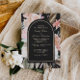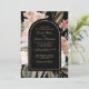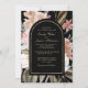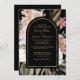 Elegant boho-style wedding invitation with pretty blush pink watercolor roses and a variety of other flowers and greenery on a black background.