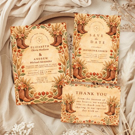 Set the tone for a warm, romantic celebration with this rustic western wedding design, featuring a beautifully illustrated garden arch framed by wildflowers, wheat details, and classic cowgirl elements like boots and hats. The earthy terracotta tones and soft vintage texture create an inviting, sun-kissed aesthetic inspired by desert landscapes and countryside charm.