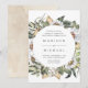 Elegant, unique floral wedding invitation featuring your wedding details encircled by white watercolor flowers and lush foliage in rich green, beige, and brown earth tones. The invite reverses to a light beige watercolor background.