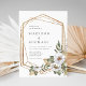 Elegant, unique floral wedding invitation featuring your wedding details framed by a faux gold foil geometric frame with a bouquet of white watercolor flowers with rich green, beige, and brown earth tone foliage. The invite reverses to a light beige watercolor background.