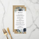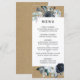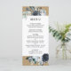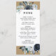 This wedding menu features watercolor peonies in navy blue, white with foliage and feathers accents on a faux rustic kraft paper background.